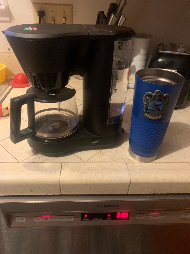 When the coffee pot stops, I’ve been pouring my coffee into this giant Ravenclaw insulated cup we got at Universal Studios on my birthday last year.